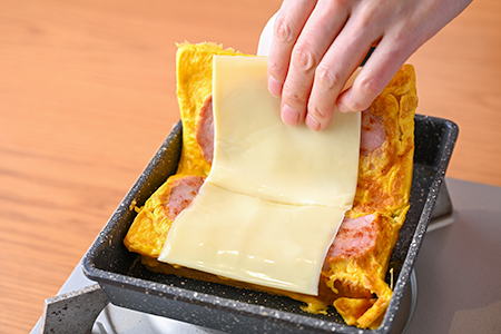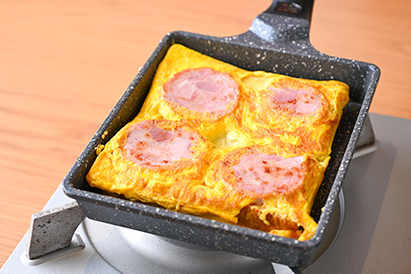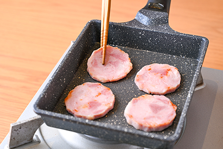 ❷卵焼き器に油を広げ、明宝ハムを両面さっと焼いて①の卵液を流し入れる。