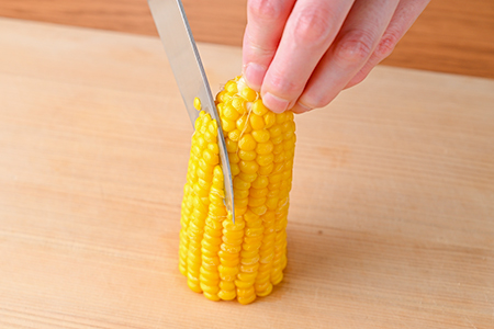加熱したとうもろこしをまな板の上に縦に置き、包丁で身をそぎ落とします。