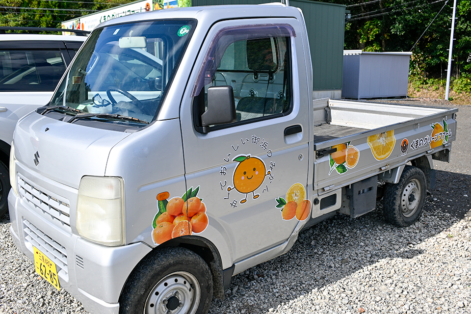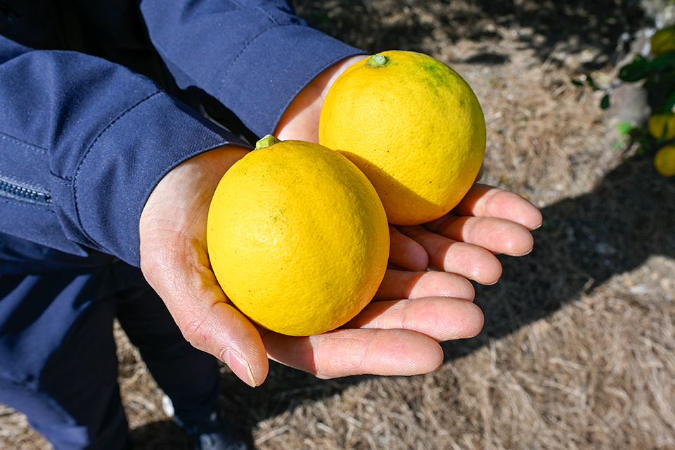 みかん、きくらげ、ブドウにイチゴ…、多様な農産物を栽培する、くまのグリーンファーム。なかでも中心となるのは、やはり「御浜と言えば」の柑橘類。みかんに接ぎ木をして育ったマイヤーレモンはくまのグリーンファームの自慢のひとつ。まるまるとした大きな実が特徴で、切ると果汁がたっぷりあふれ出す。「みかんの良さもあるのか、糖度が高く香りがいいんですよ」と話してくれたのは事業部長の西川さん。皮が薄く、苦みが少ないので、レモネードやジャムなどにも適しているという。