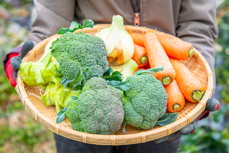 知多半島の武豊町で、一面に青々とした葉が広がる『農園ベジーネ』。中からひょっこり顔を覗かせているのは、モコモコとしたブロッコリーだ。農園を営むのは、ポージン ケンさんと友貴さん夫婦。以前は会社勤めをしていたが、転機となったのは農業体験。「タネから育てたものが、その人のエネルギーになるってすごい!」と、農業の道へ。「知多の恵みグループ」の一員として、化学肥料・農薬を使わない栽培に取り組む。