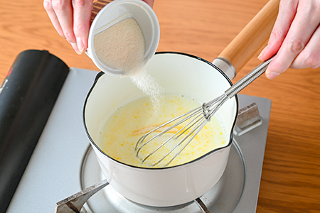2.小鍋に牛乳を入れて火にかけ、混ぜながら沸騰直前まで温める。周りに小さい泡が出てきたら火を消し、プリンの素を混ぜながら加えてよく溶かす。