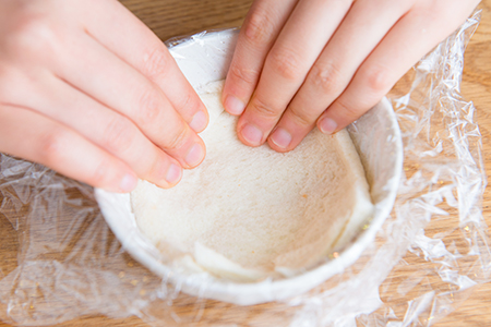 ❺茶碗にラップを大きめに敷き、①を茶碗の底の部分に敷く。空いているところに、余った食パンを敷き詰める