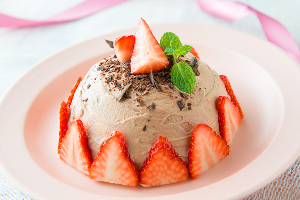 ❽⑦のまわりにスライスしたいちごを貼付ける。最後に、削ったチョコレート、いちご、ミントをトッピングする